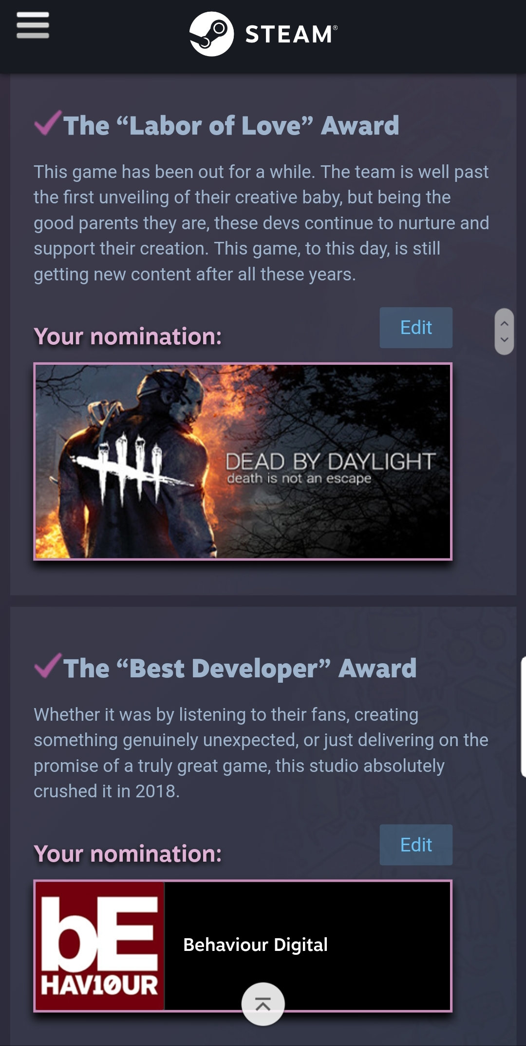 Voted for DbD in the Labour of Love category.Game still has it's issues but when you look at it today vs how it was even a year ago? Much, much better